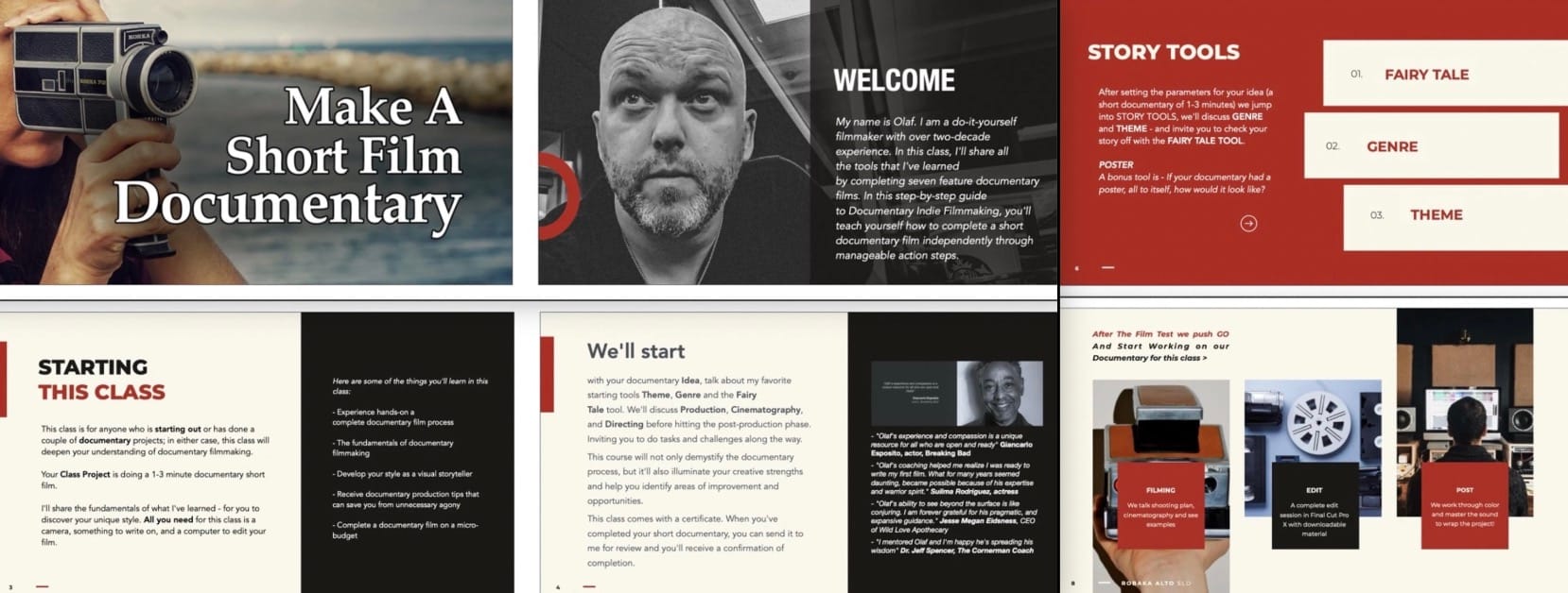 We'll start with your documentary Idea, talk about my favorite development tools Theme, Genre, and the Fairy Tale tool. We'll discuss Production, Cinematography, and Directing before hitting the post-production phase. Inviting you to do tasks and challenges along the way.