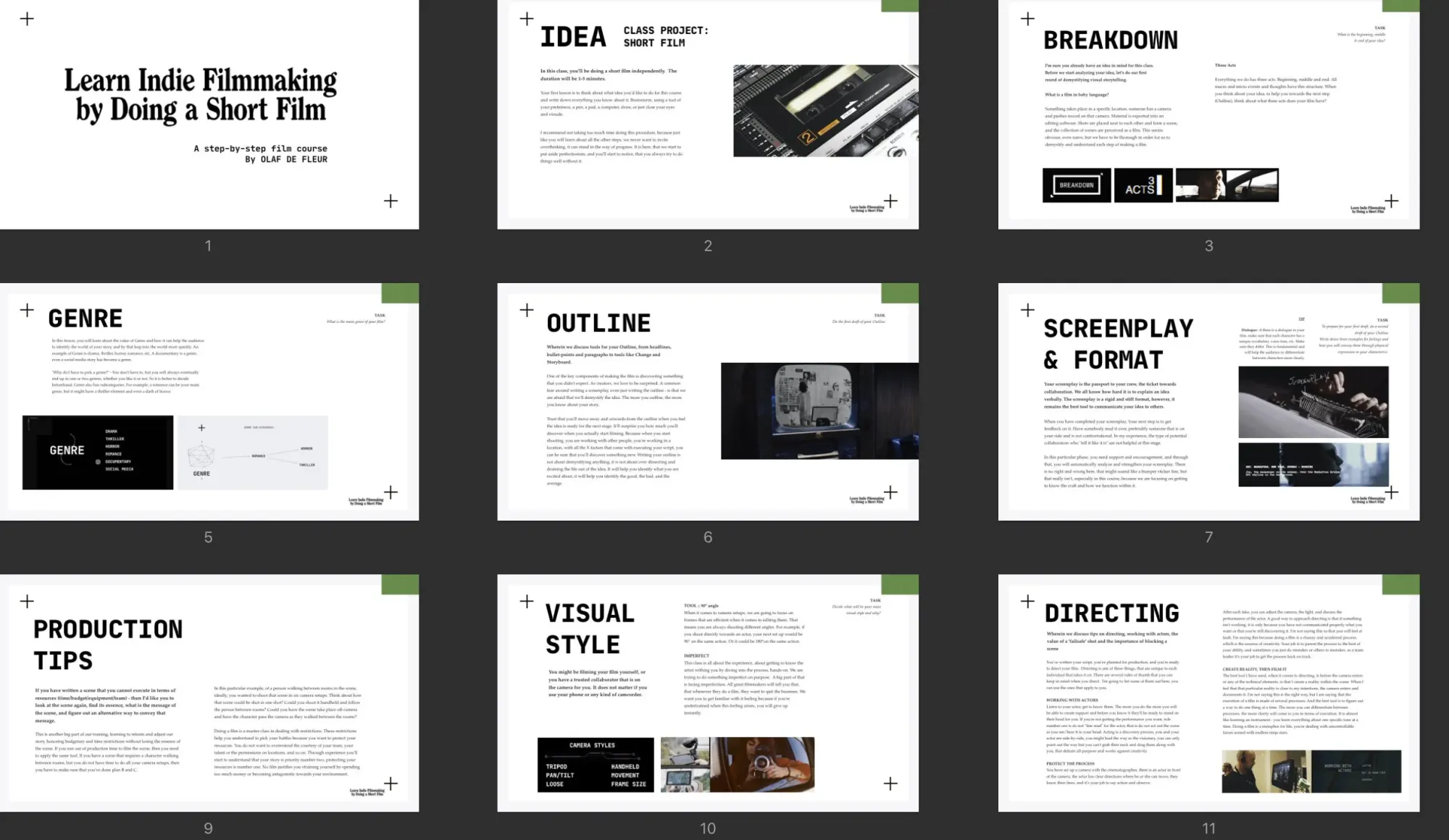 Everything starts with your Idea, and that's where we'll start. We'll dive into tools like Theme and Genre to extract it. We'll explore how to Outline before you start writing your Screenplay. We'll discuss Production, Cinematography, and Directing before hitting the post-production phase.